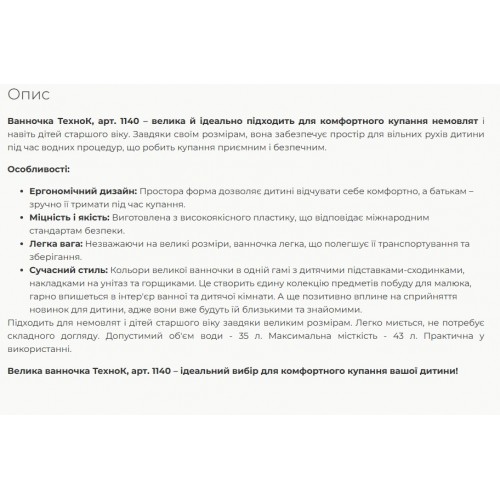 Ванночка ТехноК арт. 1140 – велика й ідеально підходить для комфортного купання немовлят і навіть дітей старшого віку. Завдяки своїм розмірам вона забезпечує простір для вільних рухів дитини під час водних процедур що робить купання приємним і безпечним