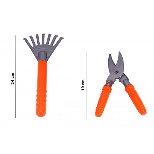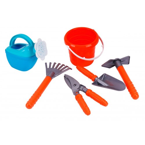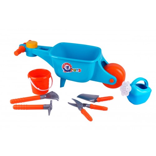 Основа набору - яскрава блакитна тачка з великим міцним колесом ніжкою та м`якими прогумованими ручками. Конструкція робить її стійкою до перекидань на поворотах спусках чи підйомах. У тачці можна перевозити яблучка зібрані у саду листя пісок або навіть своїх іграшкових друзів) Для маленьких садівників спеціальні інструменти для садових робіт: -секатор для підрізання кущів -великий совок для квітів -граблі та сапка для розпушування ґрунту -яскраве відерко -лійка для водички Всі елементи набору виготовлені з міцного якісного пластику без запаху не містять фталатів і BPA.
