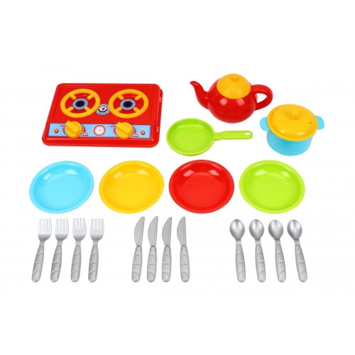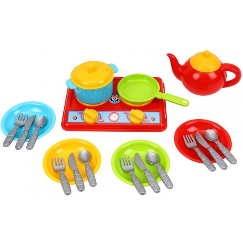 Іграшкова плита для кухні на якій дитина може готувати їжу для своїх друзів чи ляльок. У комплект входить також 4 тарілки сковорідка каструля чайник та столові прибори.