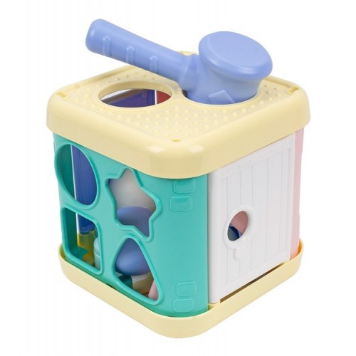 Куб має 6 сторін різного кольору та форми. Дві сторони мають двері які відкриваються в центр куба відкриваючи геометричні форми та фігури тварин. Дитина може виймати фігурки і повертати їх у відповідні отвори. На іншій стороні є два отвори куди дитина може забивати кульки за допомогою молотка. Дитина також може крутити шестерню на одній зі сторін