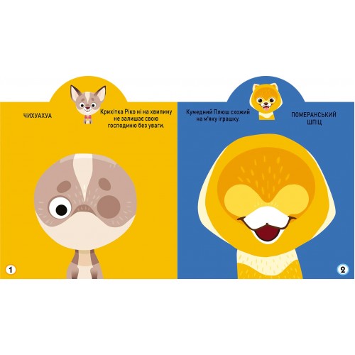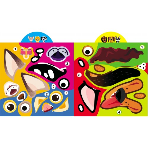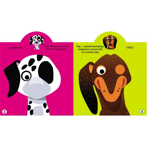Чиi це кумеднi носики  оченята й вушка? Вiдгадай  кого зображено на малюнку! Допоможи песикам повернути те  що вони втратили. Використовуй для цього налiпки. А якщо заплута шся  подивися на зразок угорi сторiнки!