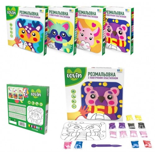 Розмальовка з повітряним пластиліном Лісові друзі . Розмір: 245х245х21 мм. Комплектація: картонна основа 24х24 см стіки повітряного пластиліну по 4г - 14 шт. стек для моделювання - 1шт. В асортименті 4 види зображень звірят: ЄНОТ ЗАЙЧИК ОЛЕНЬ ВЕДМЕДИК.